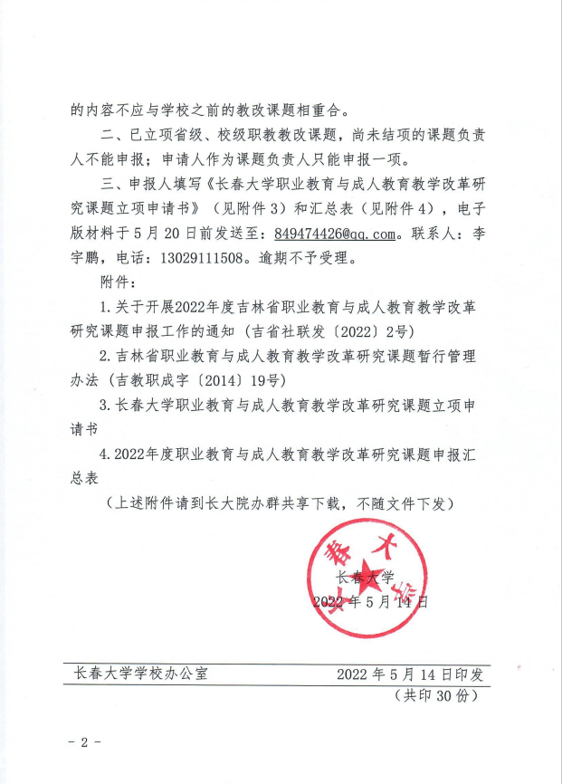 長春大學關于開展2022年度職業教育與成人教育教學改革研究課題申報工作的通知