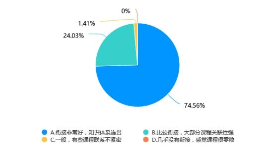 調查結果顯示,74.56%的學生認為專業課程之間的銜接非常好,知識體系連貫。這表明大部分學生對課程的整體設計和內容安排持積極態度,認為課程之間的邏輯關系和知識延續性較強。