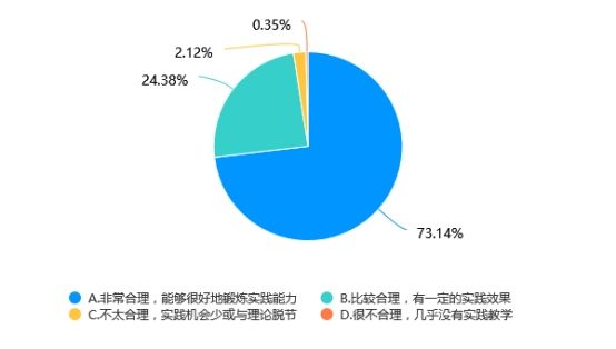 在調查中,73.14%的受訪者選擇了“非常合理,能夠很好地鍛煉實踐能力”,這表明大部分人對當前的實踐教學環節持積極態度,認為其有效提升了學生的實踐能力。