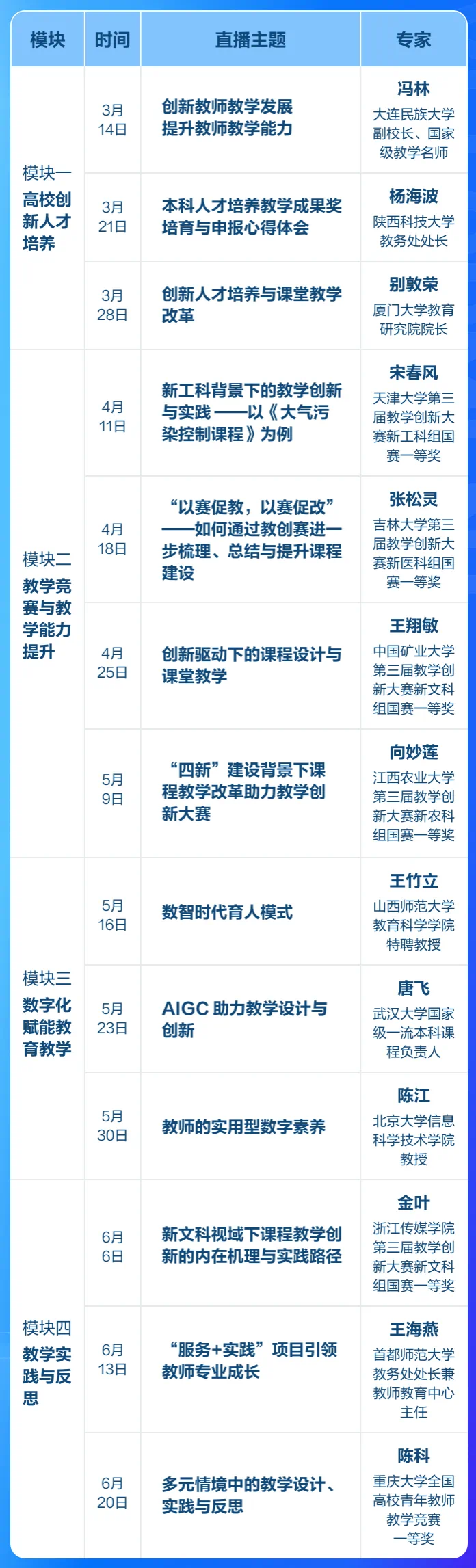 模塊一:高校創新人才培養(3期):前沿展望,聚焦教師發展與人才培養。(已結束,加入課程后可以回看)