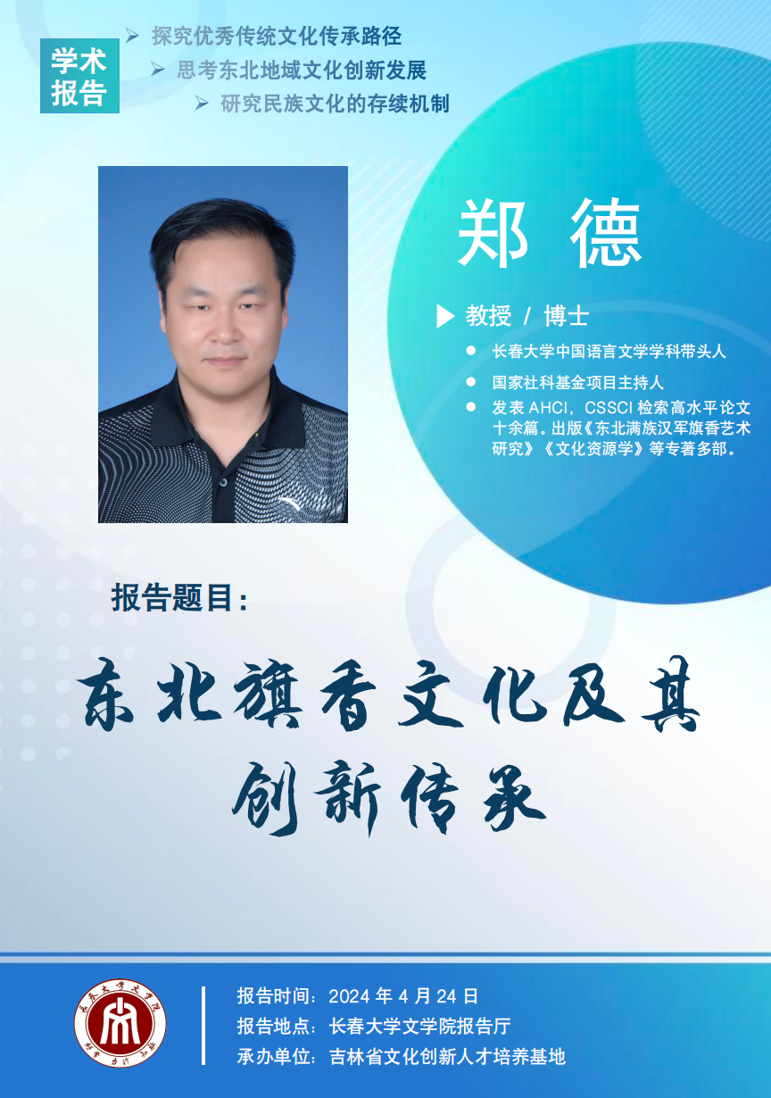 本期,基地文化創意論壇請到的主講嘉賓是長春大學文學院鄭德教授,4月24日將為大家帶來《東北旗香文化及其創新傳承》。