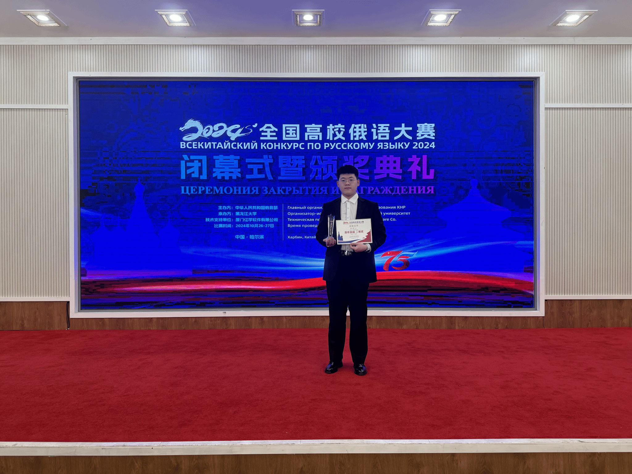 此次比賽成績不僅是對周凡棋同學個人努力的肯定,也凝聚了指導教師團隊李更偉、付何珍、馮宇和外籍教師Арина Икиликян, Марианна Балоян, Владимир Когитин等團隊成員的集體智慧和心血,更是對外國語學院俄語專業整體教學質量提升的有力證明。近幾年來,俄語專業在認知交際教學法的指導下不斷創新,在全國率先研發的學案教學手段成效顯著,開發了針對零起點的俄語強化教程,翻譯人才培養教學特色成果獲省級教學成果二等獎,俄語專業本科和翻譯碩士研究生多次在國內國外大賽中獲獎。如2024年在韓素音國際翻譯大賽中王寧教授指導的23級俄語筆譯碩士研究生別雅蘭同學獲得俄譯漢優秀獎,在2024年第八屆普譯獎全國大學生翻譯比賽中獲得國家級一等獎;楊艷、高羚老師指導的《譯路同行— 共赴“一帶一路”十年之約》獲吉林省挑戰杯大賽金獎;在中國國際大學生創新大賽(2024)中由高羚、楊艷兩位老師指導,俄語專業學生完成的《駝鈴絲路有書香:“一帶一路”點亮“譯帶藝路”》項目獲得銀獎,還有劉春雨、郭曉鑫、張雨等多名同學在黑龍江省翻譯大賽、遼寧省翻譯大賽、2024年全國大學生創新創業能力大賽、俄語奧林匹克大賽等競賽中斬獲佳績。長春大學俄語教師團隊在學科帶頭人王金玲院長的帶領下,依托外國語言文學省級優勢特色學科、俄語國家級一流本科專業和俄語筆譯專業碩士點,以俄語語言文化為基礎、俄漢高端翻譯人才培養為特色,不斷改革人才培養模式,融合新的教學理念、豐富教學資源、創新教學方法與手段來促使學生深入學習俄語語言文學,培養語言基本功扎實、具有國際視野和跨文化交際能力的應用型、復合型高素質俄語人才。